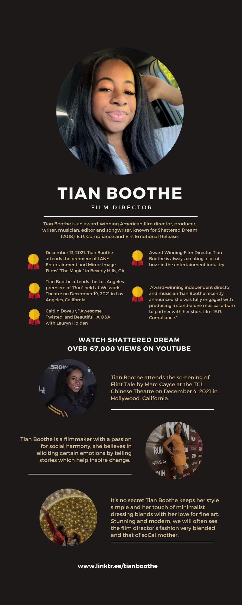Tian Boothe is an award-winning American film director, producer, writer, musician, editor and songwriter, known for Shattered Dream (2018), E.R. Compliance and E.R. Emotional Release.